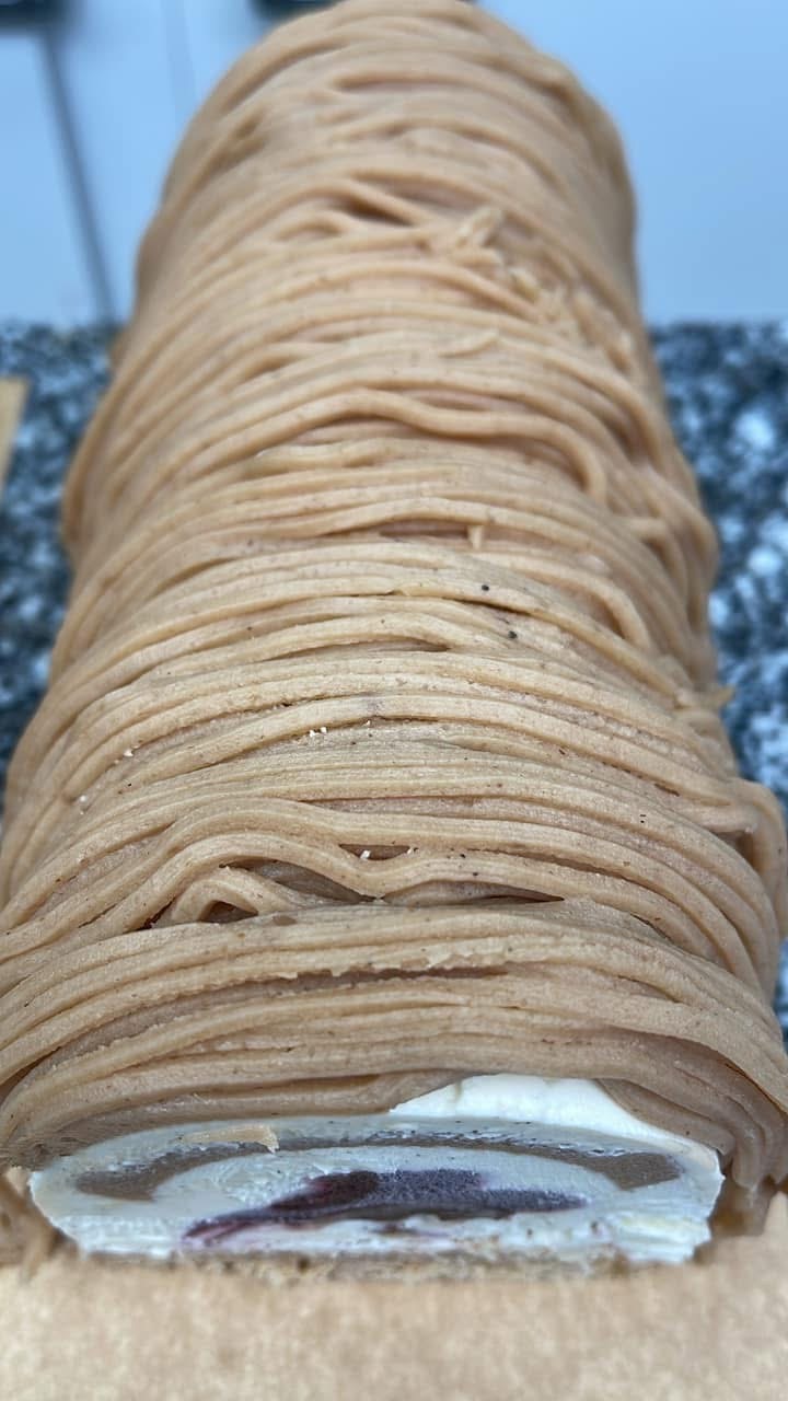 Biscuits aux amandes , ganache montée vanille et crème de marrons, insert de cassis, crème de marrons,