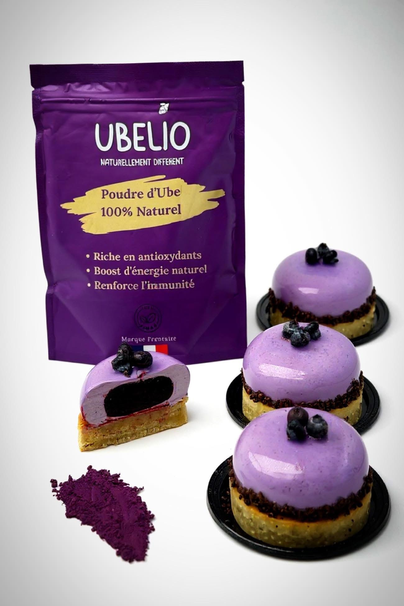 Fond de pâte sucrée crème d’amandes, ganache montée vanille de Madagascar et poudre de UBE, insert de confit de cassis de Bourgogne.