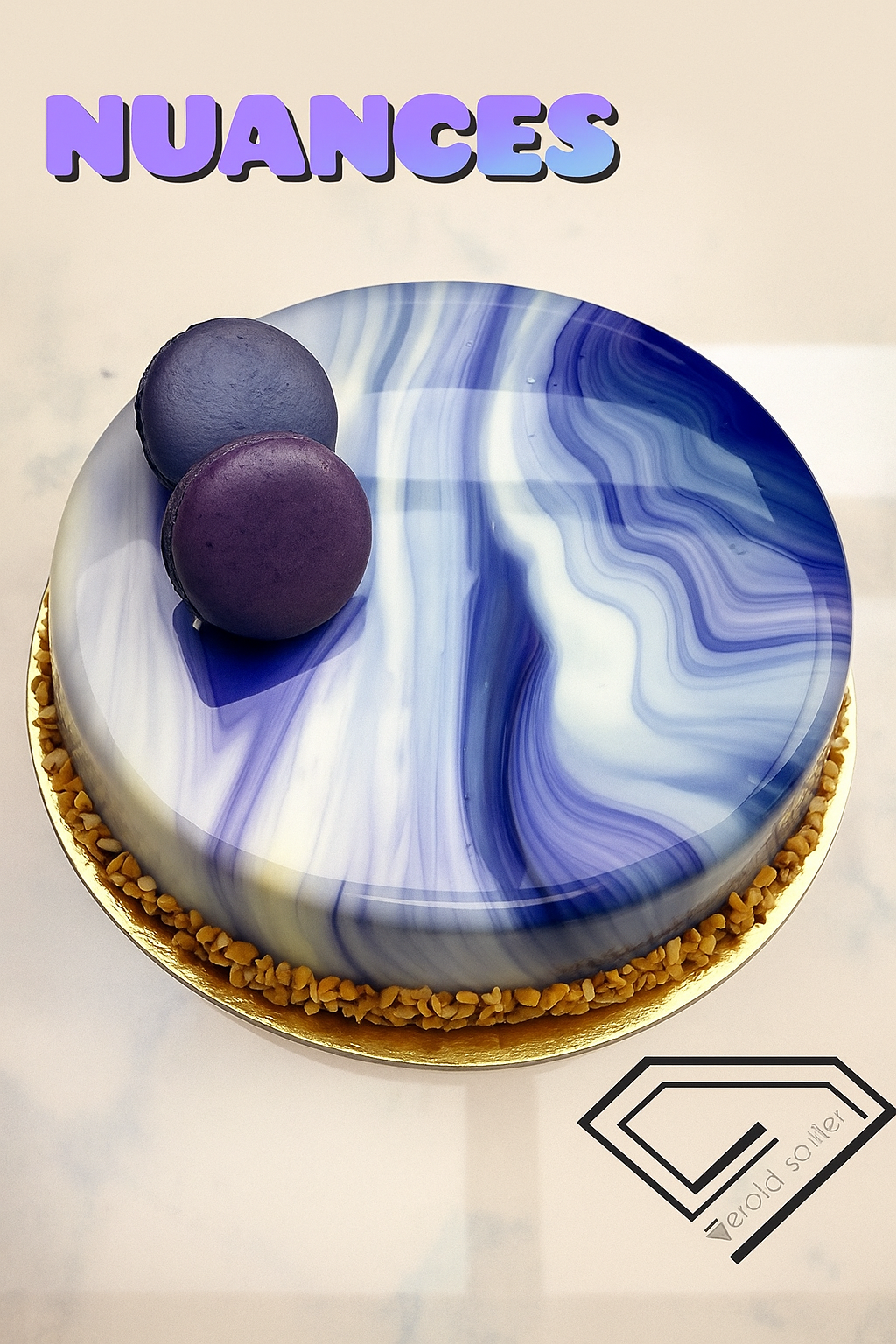 Composition: crème légère aux deux chocolats , insert de crémeux au confite de pétales de violettes, biscuits aux amandes